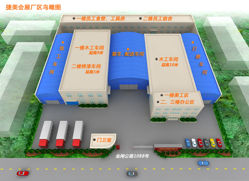 捷美工廠位于上海市奉賢區金閘路1088號,位于上海國家會展中心及上海新國際博覽中心中間位置距各大型展館僅需45分鐘車程.工廠占地8000平米,整體區分為辦公區;展覽制作車間;道具制作車間;鐵藝車間;美 工車間;倉儲庫房;宿舍樓以及食堂.